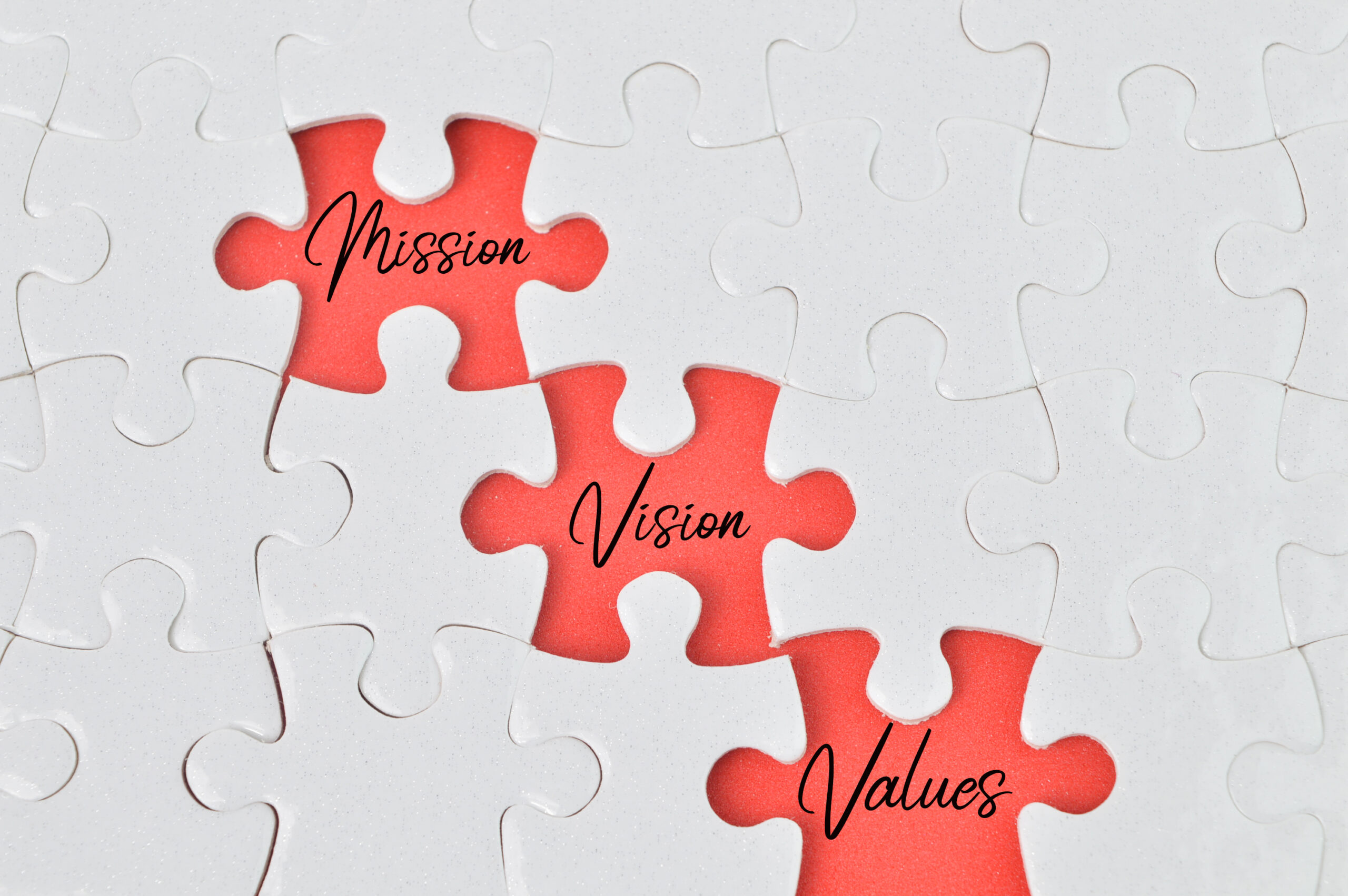 Missing jigsaw puzzle with the word MISSION, VISION and VALUES.